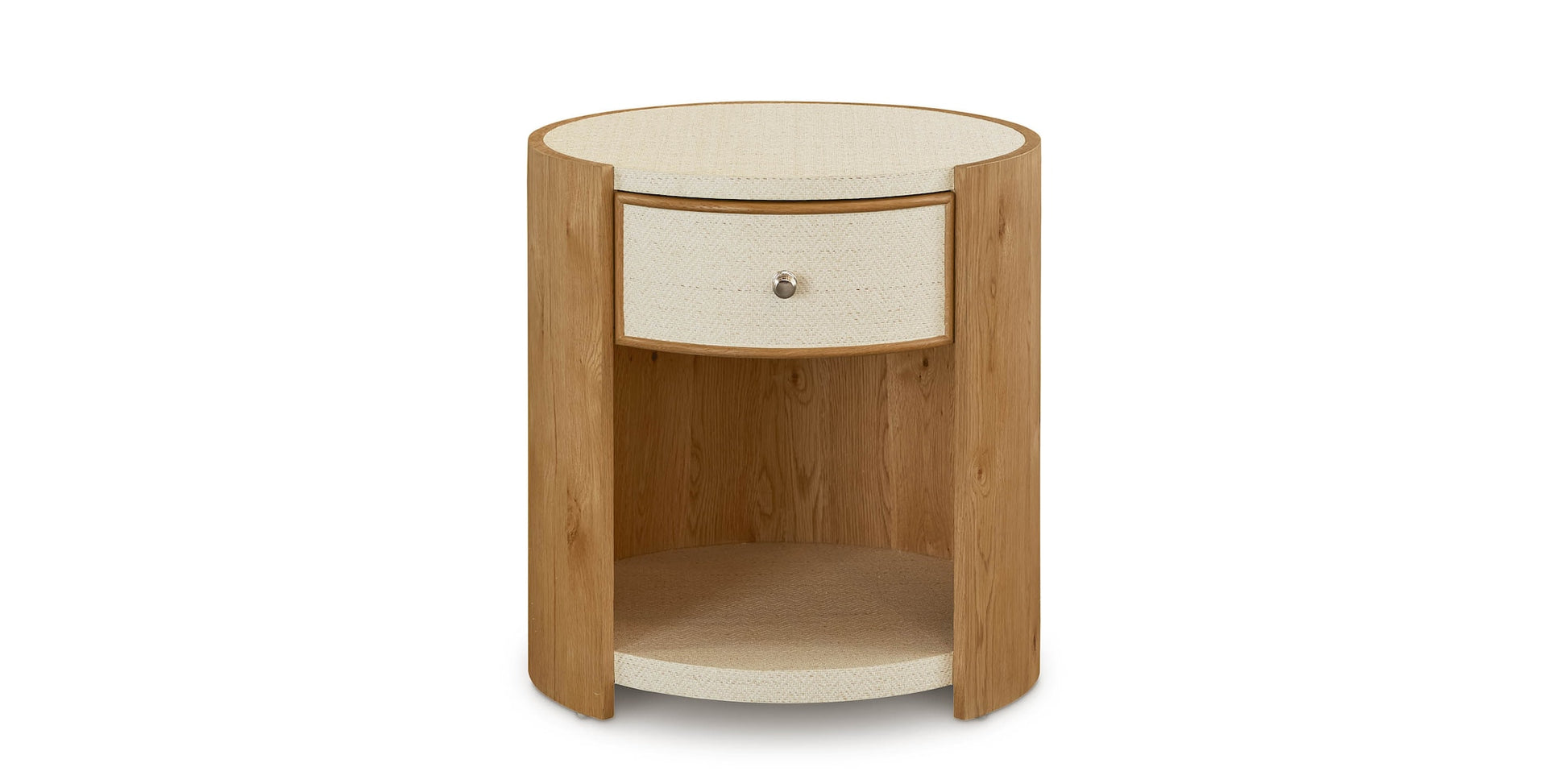 Introducing the Bassett Newbury Round Open Front End Table. Crafted with elegant white oak or textured gesso, this modern piece seamlessly combines materials and geometry. Perfect for creating an inviting and sophisticated living room atmosphere. Available now from Bassett.