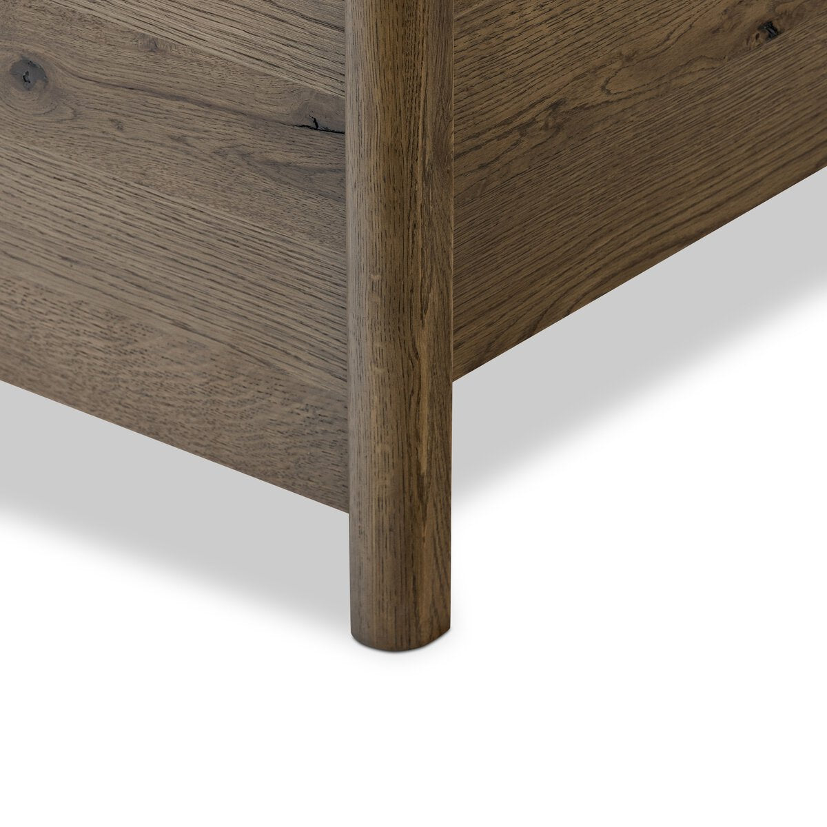 A heritage-inspired bed features soft curves and intricate carving along a rustic oak frame. A light, linen-upholstered headboard brings a touch a warmth to bedroom styling. Performance fabrics are specially created to withstand spills, stains, high traffic and wear, ensuring long-term comfort and unmatched durability.