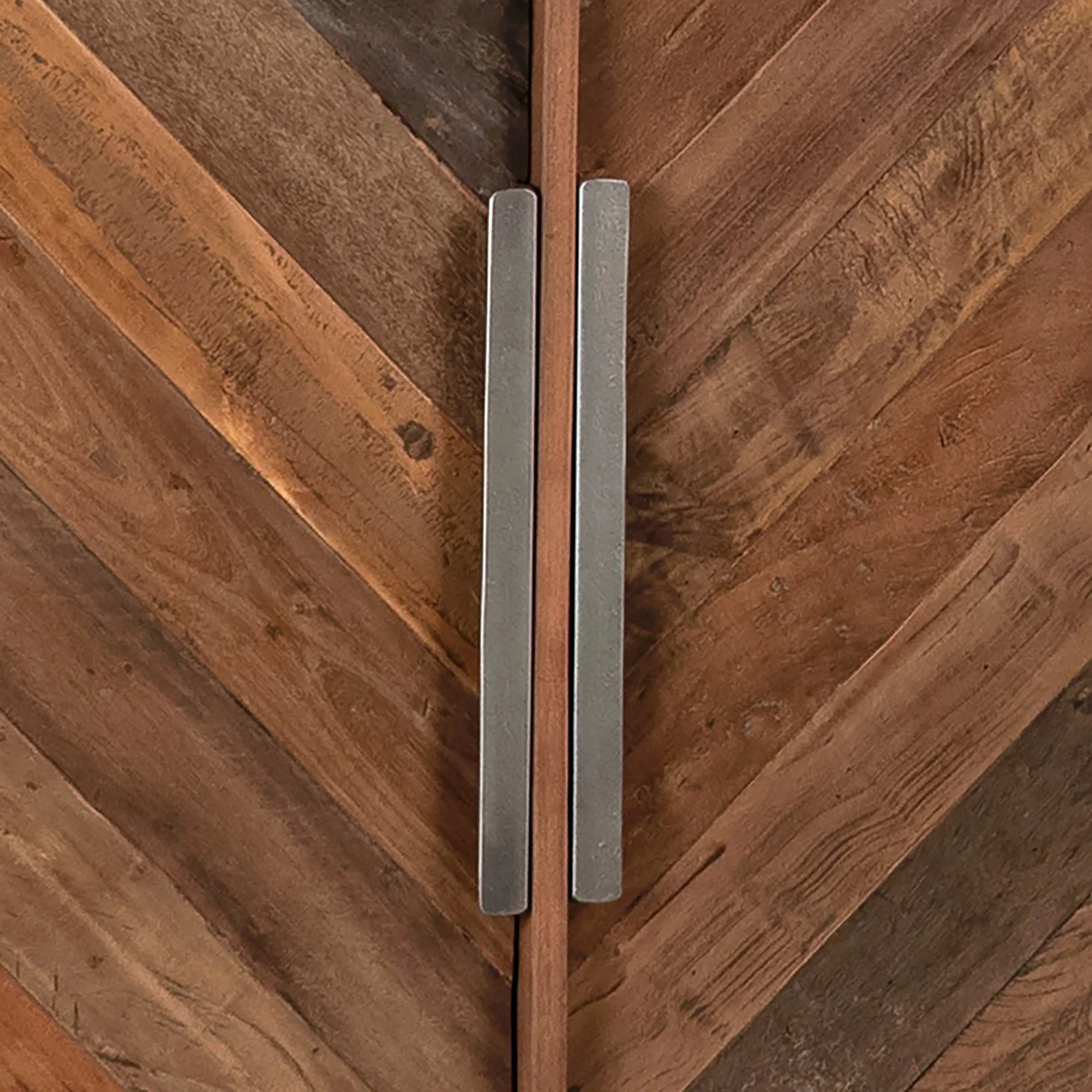 Bring the natural beauty of reclaimed craftsmanship to your space with the Hunt sideboard. Made with a mix of solid reclaimed hardwoods, you'll find a variety of natural colors and grains that add life and texture. The fun herringbone pattern on each of the four door panels add a fun design element to the cabinet. Each door accented with stylish antique nickel finished steel handle for easy access to the ample storage inside. Once opened, each door hides a cubby with a built-in shelf with enough storage for everyone.