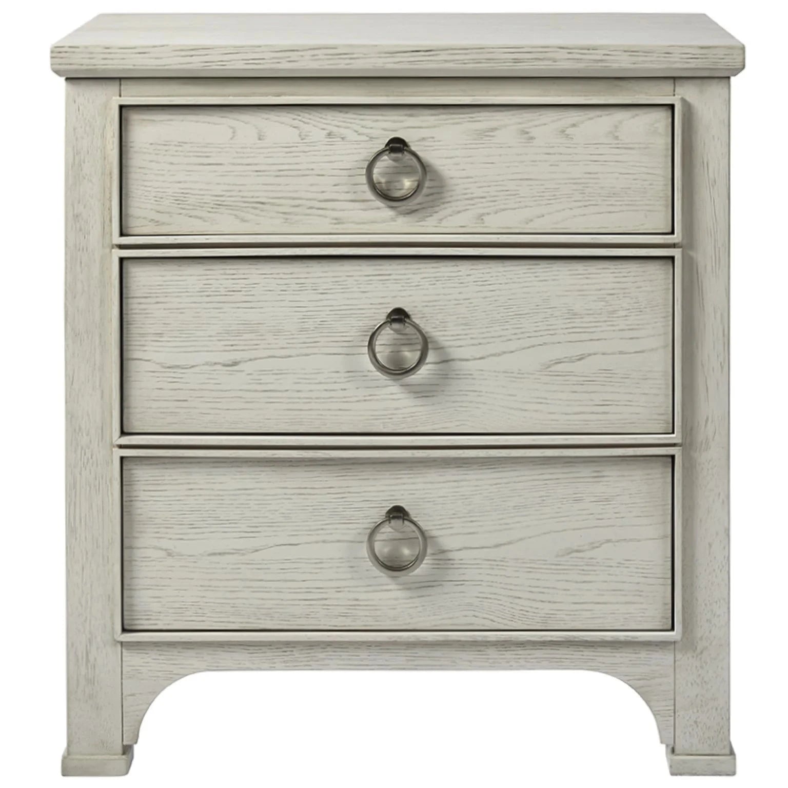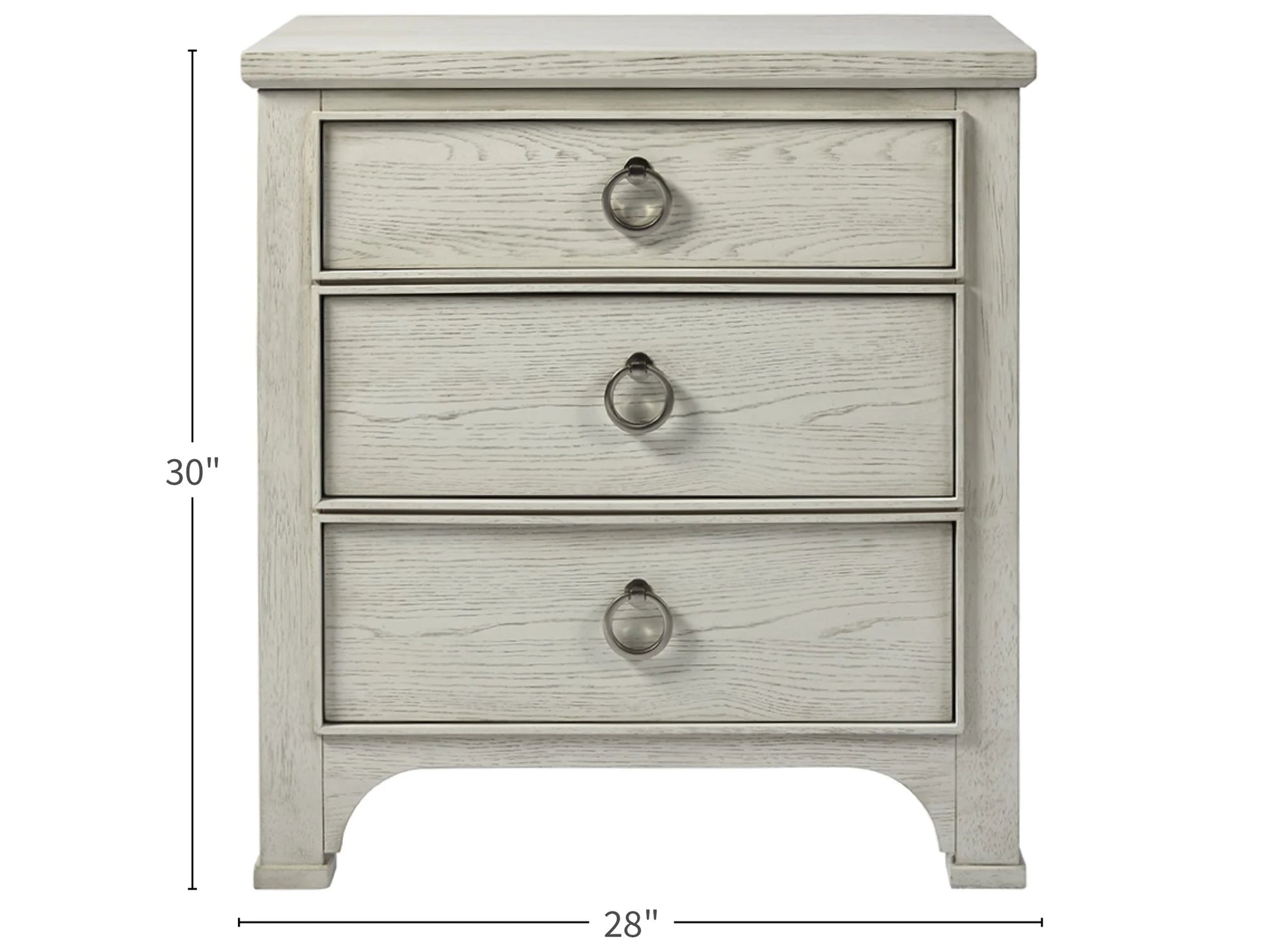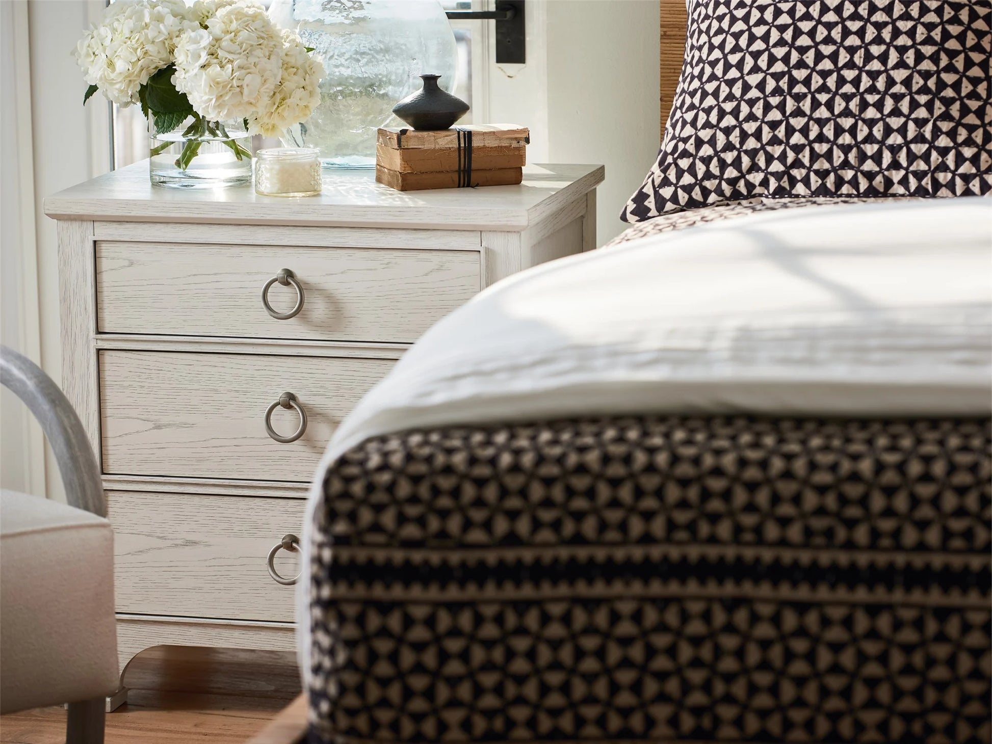Enhance your bedroom with the Escape Nightstand, a minimalist bedside table featuring clean lines, three drawers, and coordinating ring-pull hardware. The neutral Sandbar finish adds a subtle touch of warmth to your space.