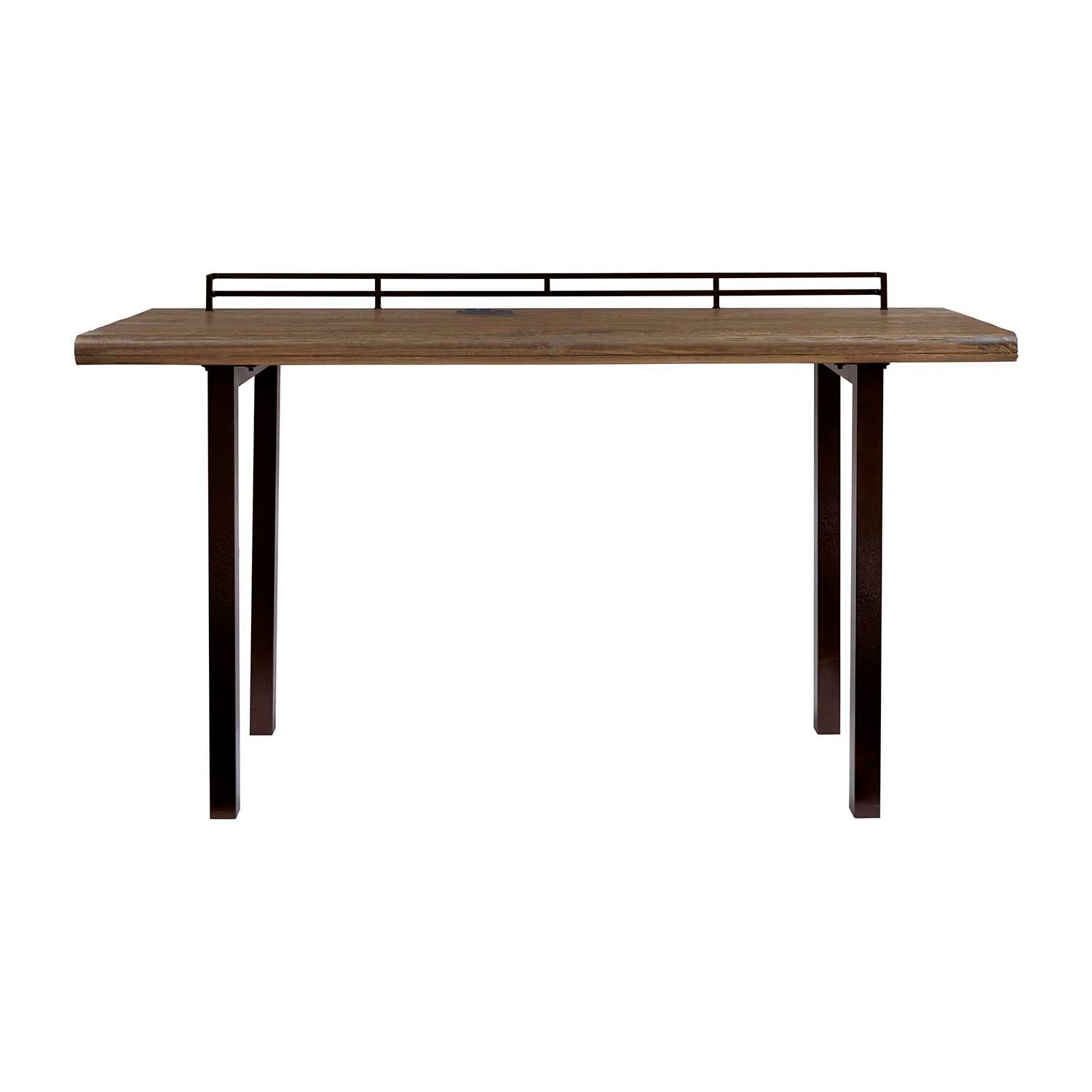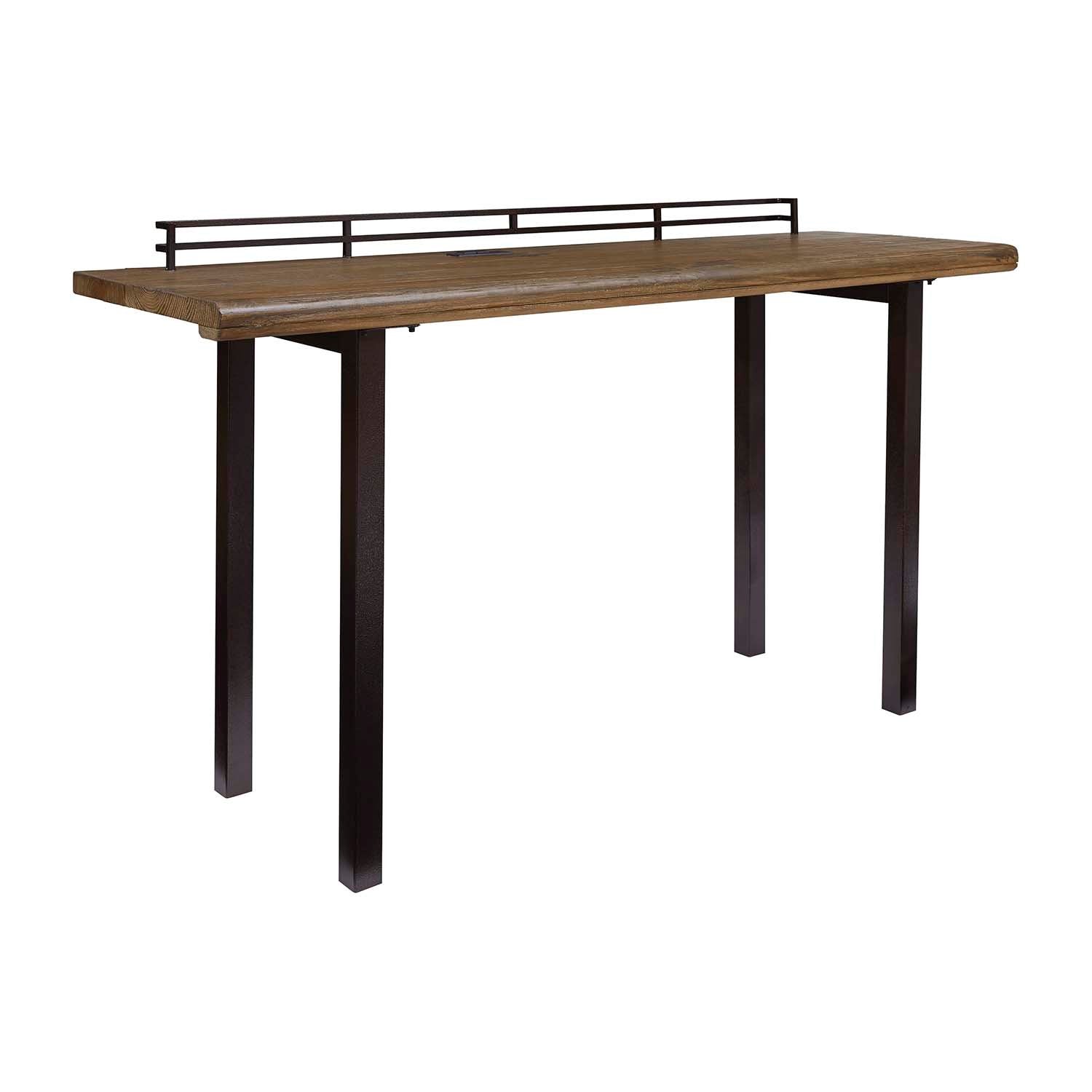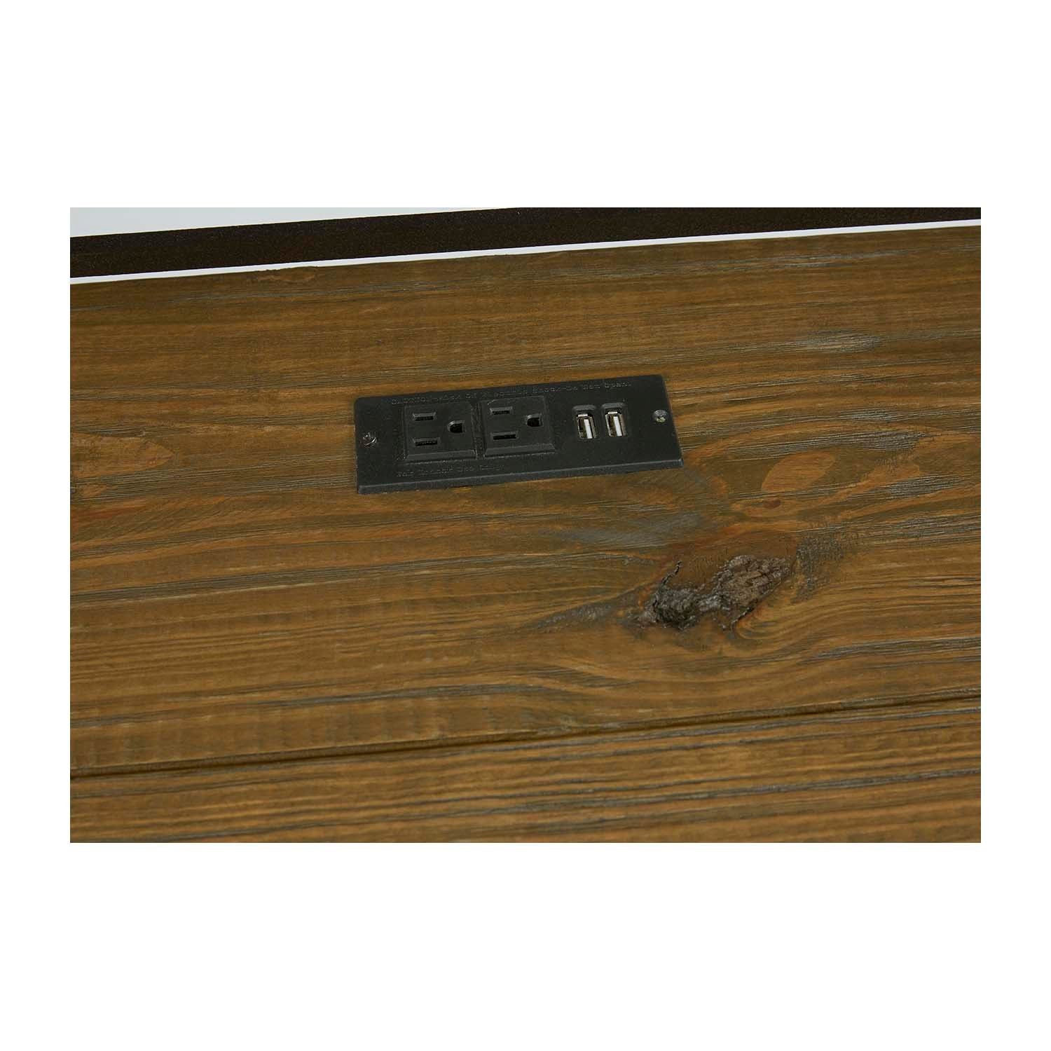 A counter table that can serve many purposes. It is supported by a steel frame and finished in a rustic black finish. Functionality is key with the addition of an electrical outlet with USB ports. Electrical outlet with 2 plug ins and 2 USB ports. Great natural finish seals in the historical charm of each unique table making it one of a kind.