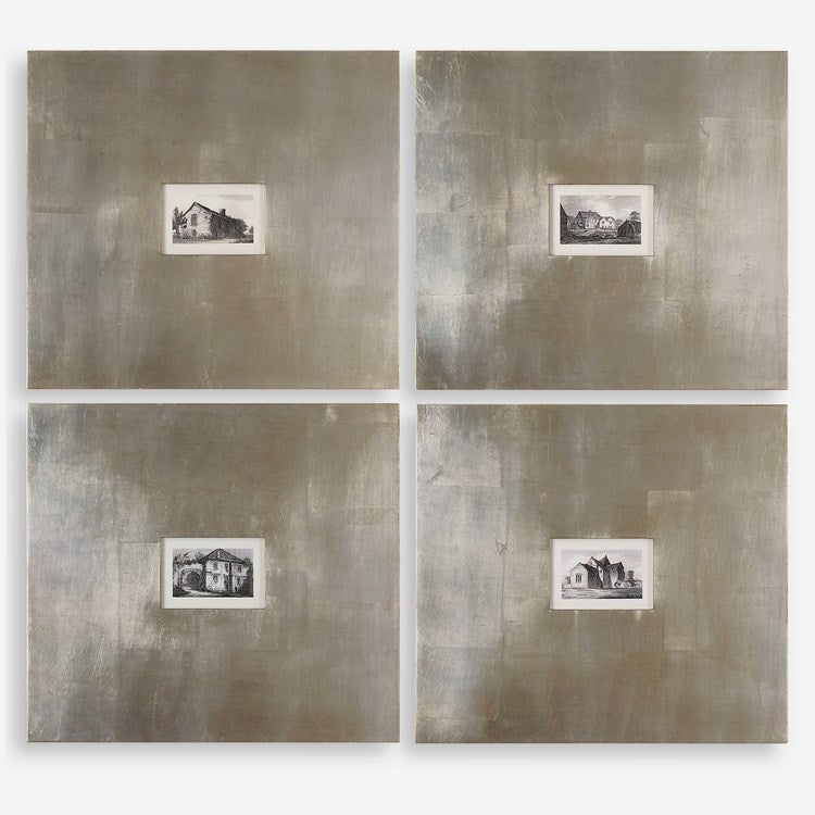 These vintage, architectural prints showcase a simple, black and white color scheme. These prints are surrounded by an elegant 8" wide frame with a champagne silver leaf base and a light brown glaze. Each print is placed under protective glass.