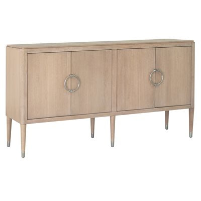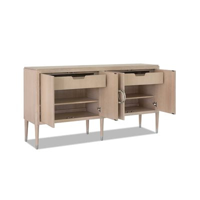 Crafted with quartered white oak, curved pilasters, and brushed metal accents and feet, the Klassuner Sideboard boasts a natural finish for a modern yet elegant touch.