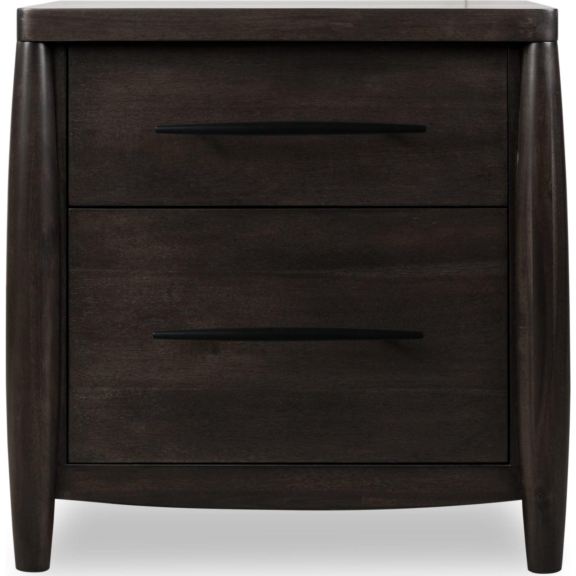 Introducing the Koko Two Drawer Nightstand with Cord Management in Minx. Crafted from open-pore wood and finished in a rich semi-gloss black stain, this nightstand features tapered cylindrical shapes for a global modern design. Keep cords organized with the built-in cord management system.