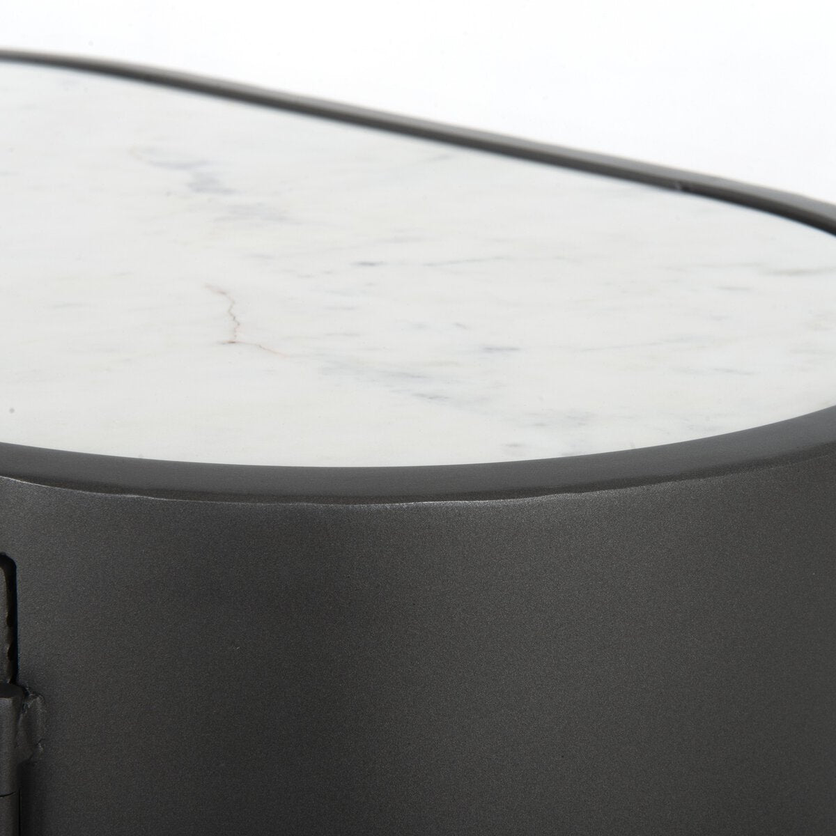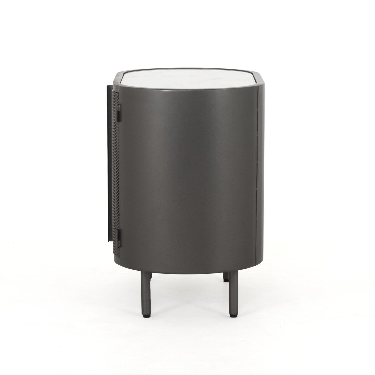 This unique nightstand combines a modern twist on late-seventies style with industrial elements. The gunmetal-finished iron frame features rounded and perforated details, giving it a unique pill shape. A sleek, polished white marble top adds a touch of material interest to this intriguing piece. It also includes interior shelving and a rear cutout for cord management.