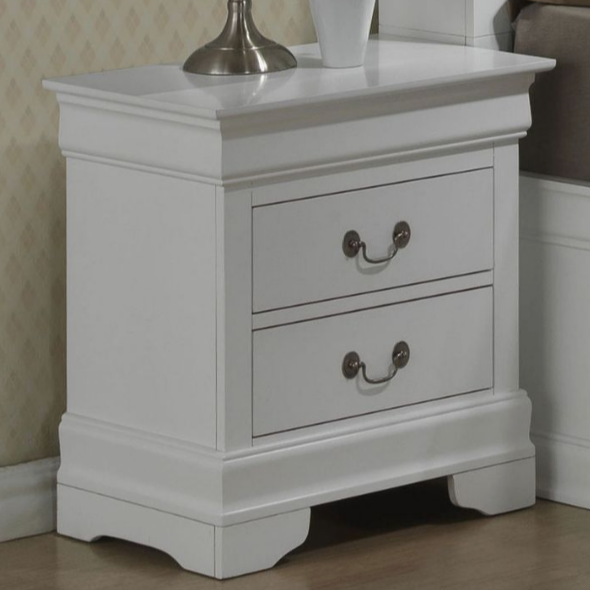 This nightstand features a classic Louis Philip style in a modern white finish to fit various decors. It offers extra storage space with its two drawers and stands on elegant bracket legs.