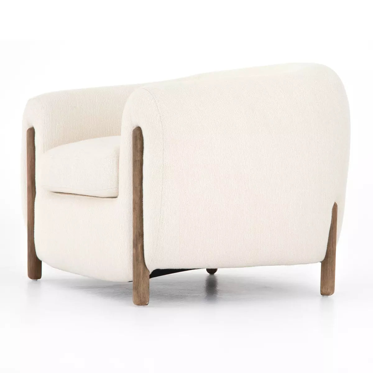 A fresh take on the traditional tub chair, with exaggerated depth for drama and comfort. Solid rubberwood legs intersect ivory upholstery for clean contrast of color and scale.