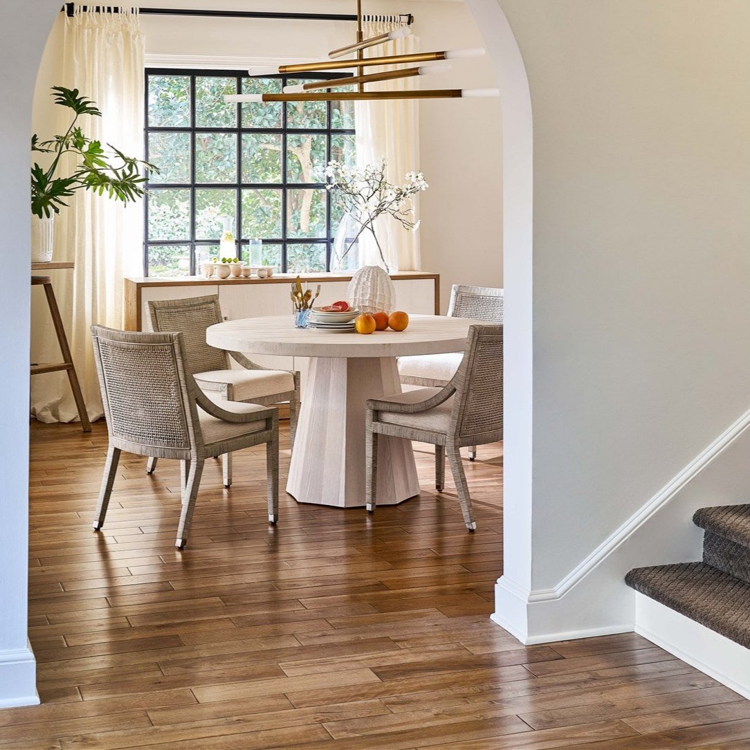 With its optional 20 inch leaf, the MACKINAW ROUND DINING TABLE can easily extend to a length of 74 inches, perfect for accommodating larger parties. The table is finished in a crisp and elegant White Sand tone.