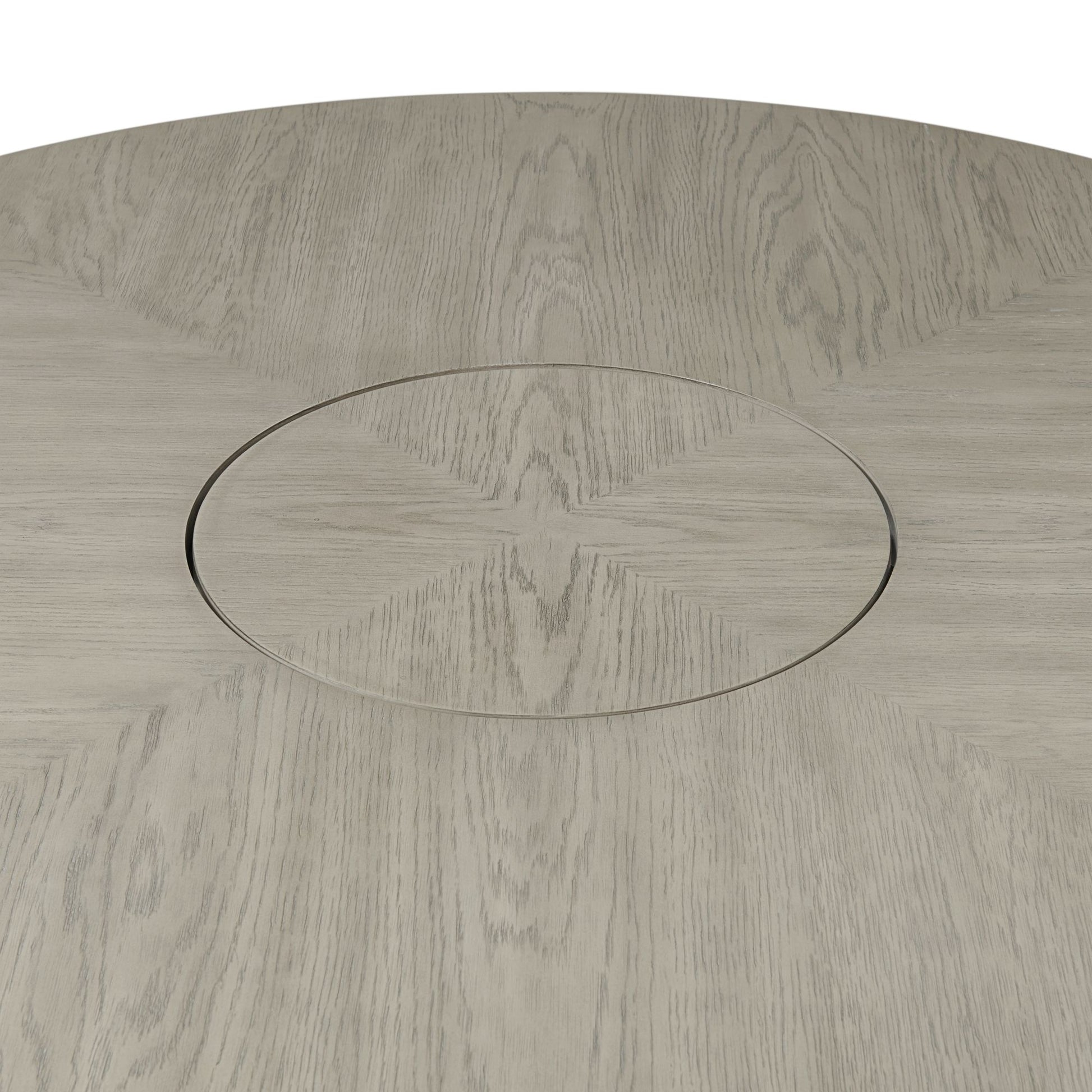 Crafted of solid and manufactured wood in a inviting gray finish. The gray finish has a textural design that showcases the natural wood grain. This dining table strikes a round shape with an eye-catching trestle base. Features a built-in lazy susan at center, with a simple rotation all of your family will be able to access the condiments they want without having to reach over each other.