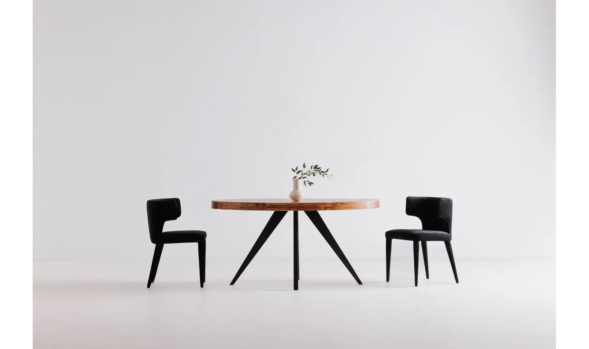 The Parq Oval dining table is a sophisticated fusion of modern design and rustic charm. Each piece of solid Acacia is meticulously hand-selected to create a visually interesting tabletop, with careful consideration given to the natural variations and final appearance of each individual piece. The table's parquet-patterned top is complemented by elegant, black-painted legs, the robust industrial metal base providing a striking contrast.