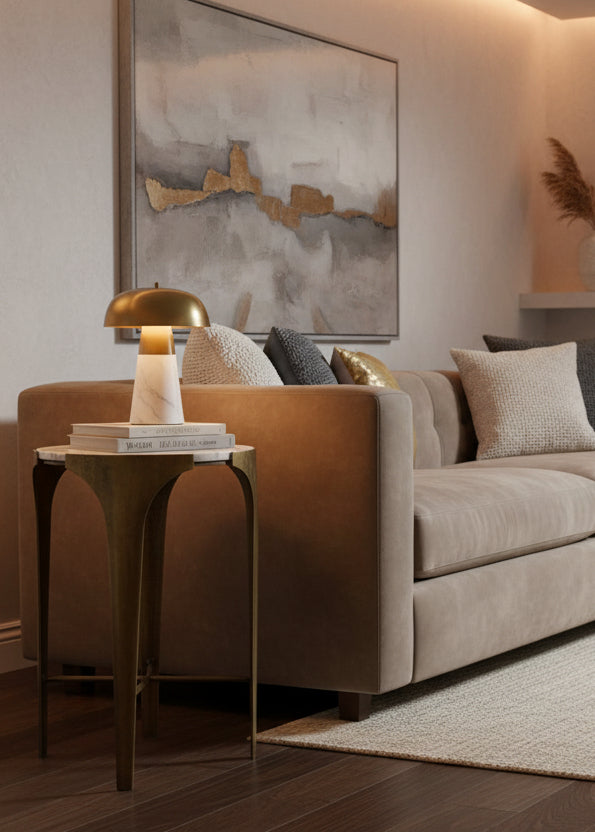 Elevate your living space with this refined side table, where timeless materials converge in sophisticated design. The sturdy iron base, finished in warm antique brass, provides an elegant foundation that complements both traditional and contemporary interiors. Topped with genuine white marble, this piece offers a luxurious surface perfect for displaying décor, holding beverages, or serving as a functional accent. The natural veining in the marble ensures each table is uniquely distinctive. An ideal choice for discerning homeowners seeking quality craftsmanship and enduring style.