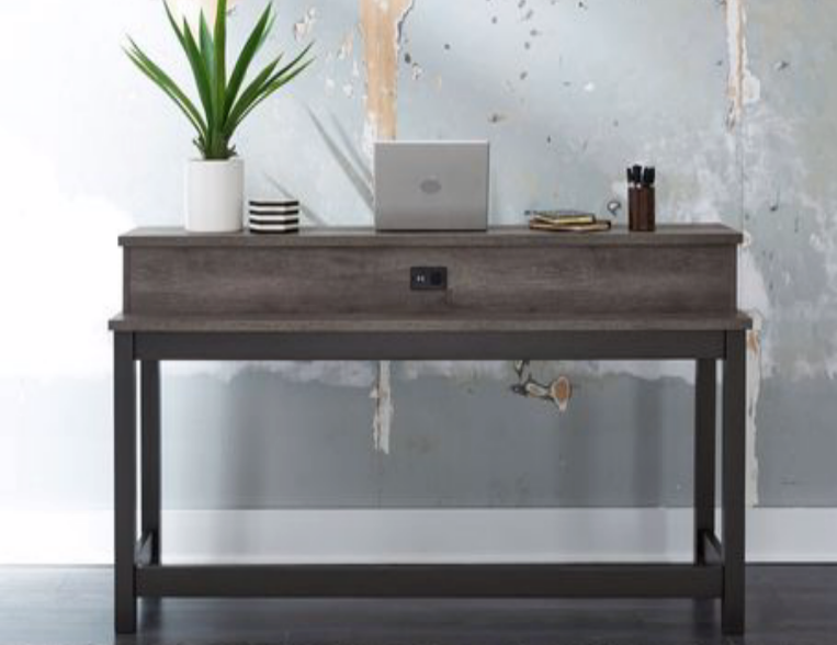 Enhance your home with the Tanners Creek console bar table - a stylish and functional piece made of durable melamine and a sturdy rubberwood solid frame. Featuring a sleek Greystone finish, three storage cubbies, and a built-in charging station with one AC outlet and two USB ports. Elevate your decor with this elegant table.