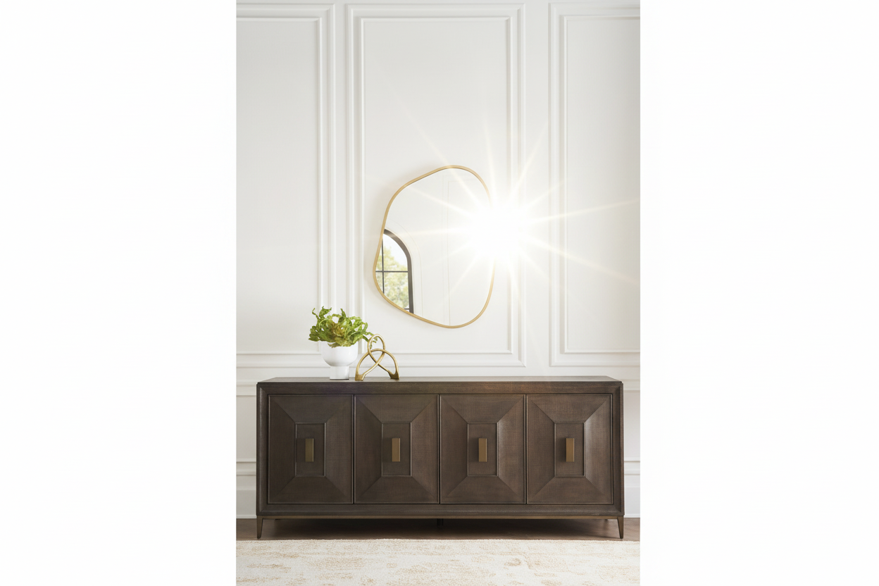 The Universal Montclair Credenza combines aesthetic appeal with functionality, featuring an Embossed Cocoa finish and striking geometric door fronts. Its six adjustable shelves, central power bar, and wire management ensure organized media storage, while the Smoked Gold metal base offers stability and enhances contemporary design.