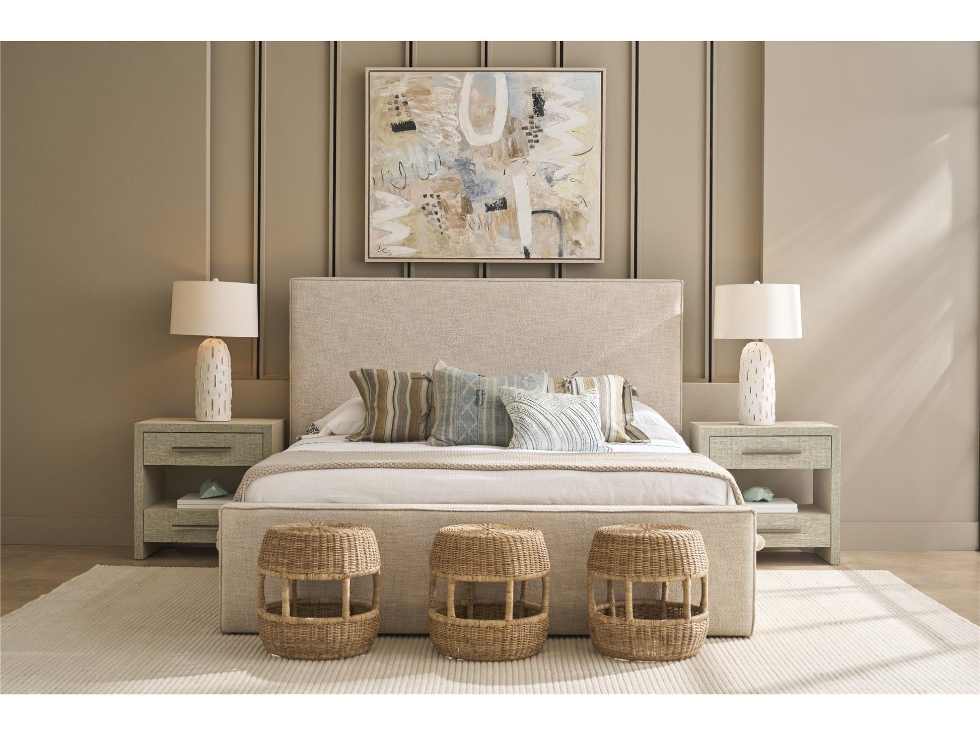 The Seascape Nightstand combines closed storage with an open shelf space, all wrapped in textured Seascape grasscloth wallpaper. This perfectly proportioned nightstand offers the perfect balance of surface area and storage while bringing rich texture to your coastal bedroom.